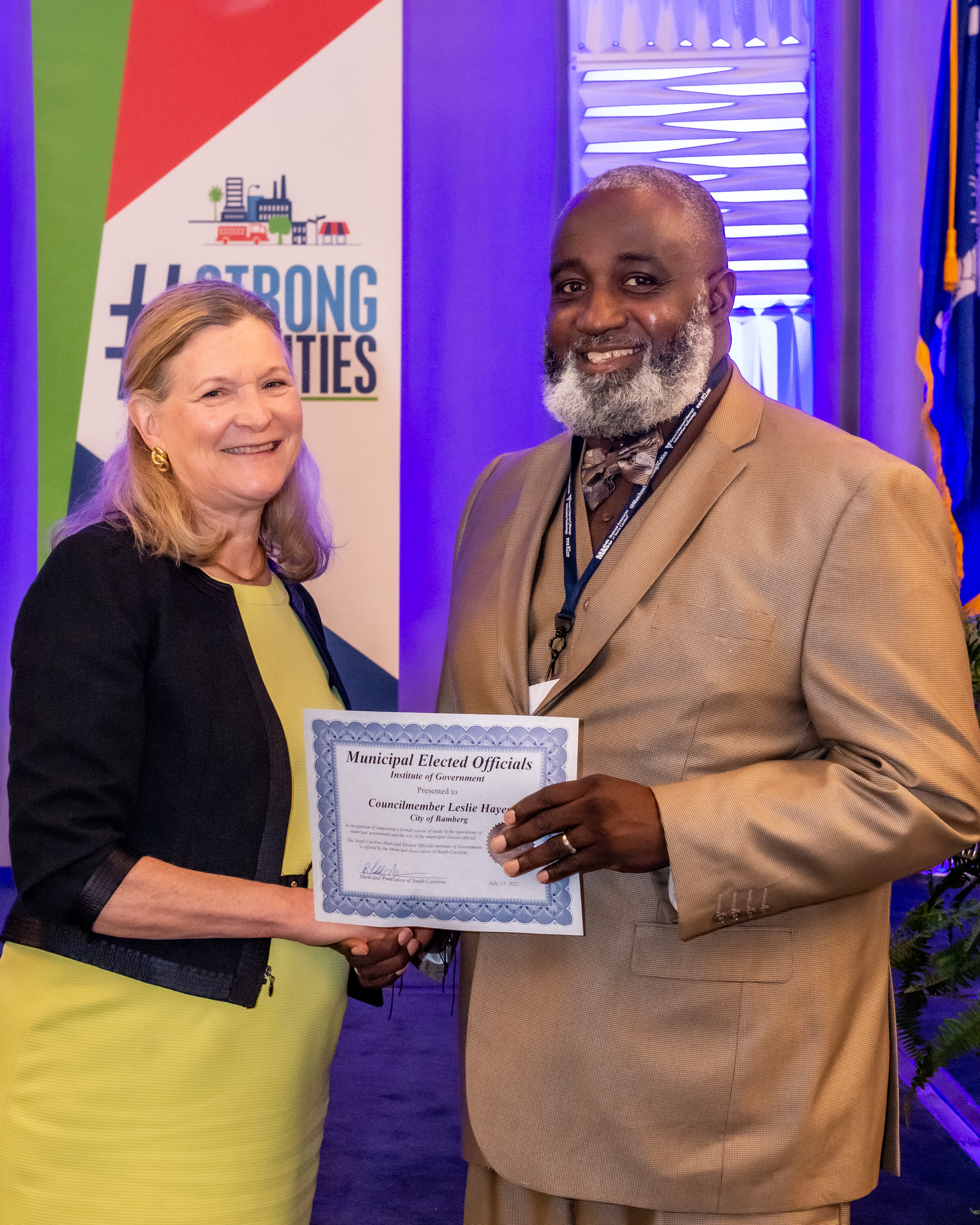 Councilmember Leslie Hayes from the City of Bamberg graduated from the Municipal Elected Officials Institute of Government. Graduates received their certificates during the Municipal Association of South Carolina’s Annual Meeting in July.