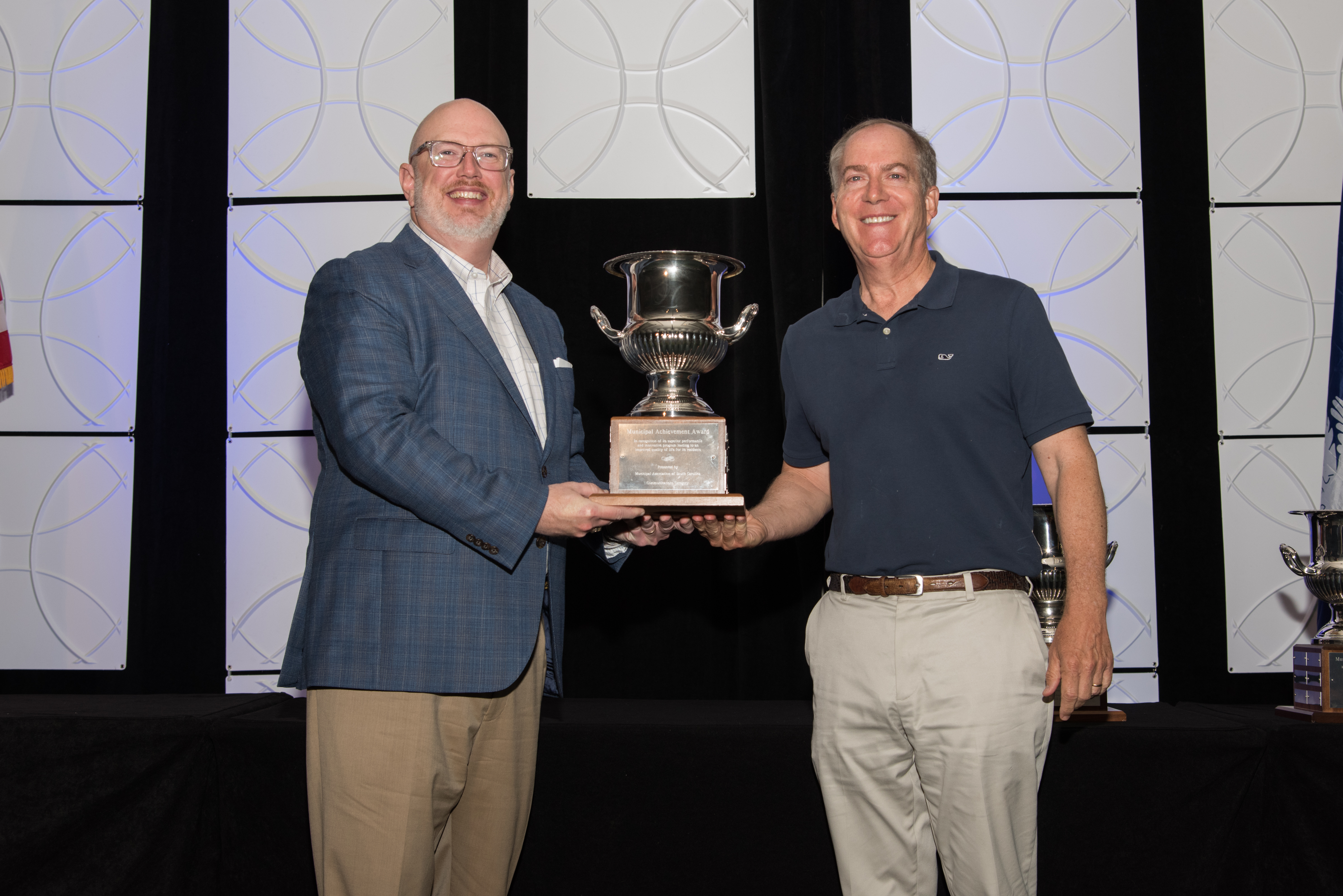 Municipal Association Executive Director Todd Glover, left, presents an Achievement Award trophy for the Communications Category to Greenville Mayor Knox White during the 2021 Annual Meeting on Hilton Head Island. (download photo)