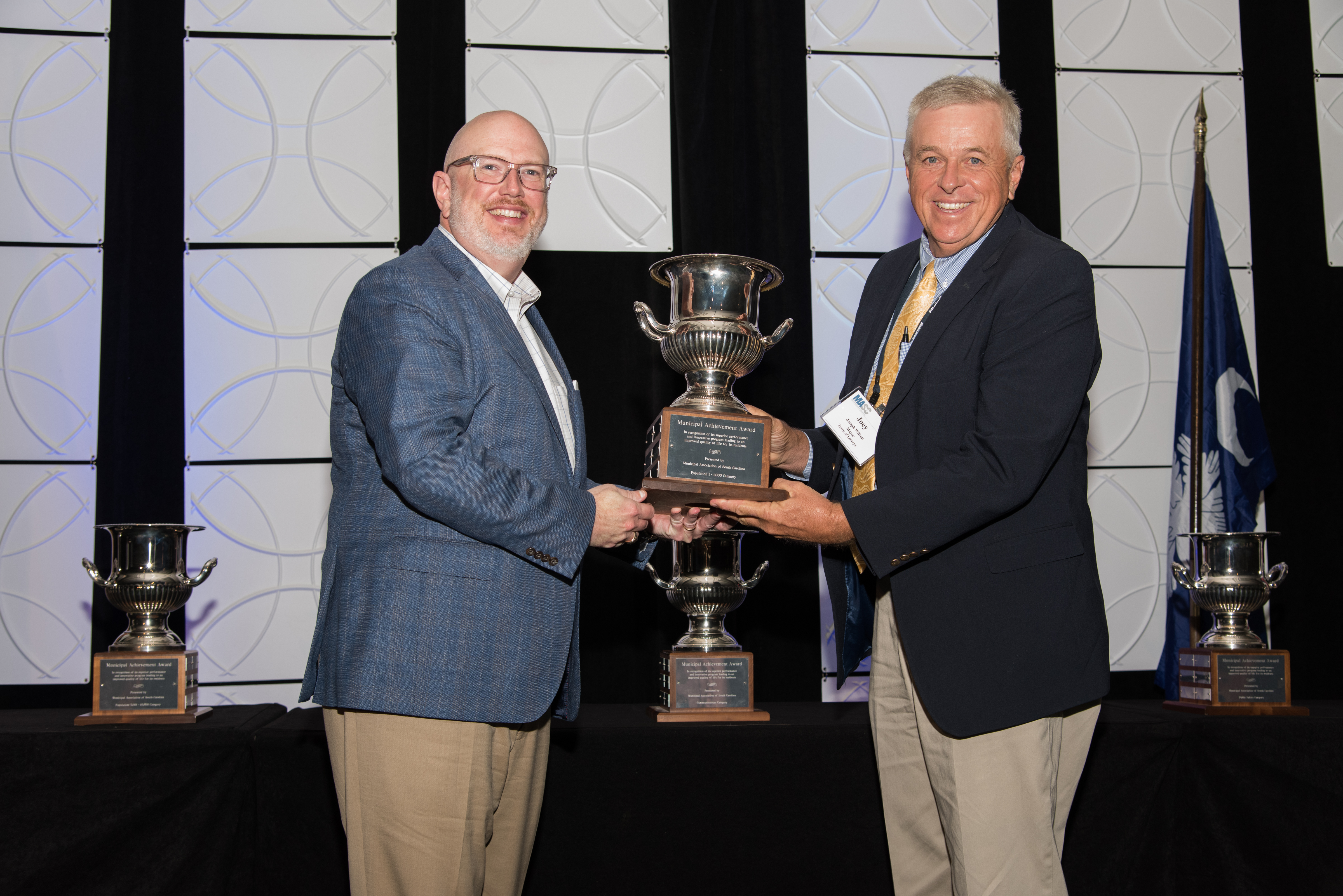 Municipal Association Executive Director Todd Glover, left, presents an Achievement Award trophy for Population 1 — 1,000 Category to Lowrys Mayor Joseph Wilson during the 2021 Annual Meeting on Hilton Head Island. (download image)