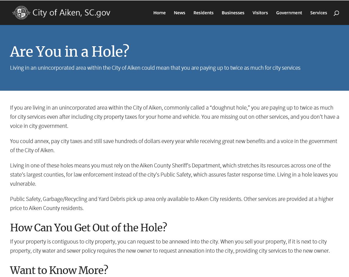 The City of Aiken offers a webpage for residents living in an unincorporated area of the city, known as a doughnut hole, which explains how to request annexation.