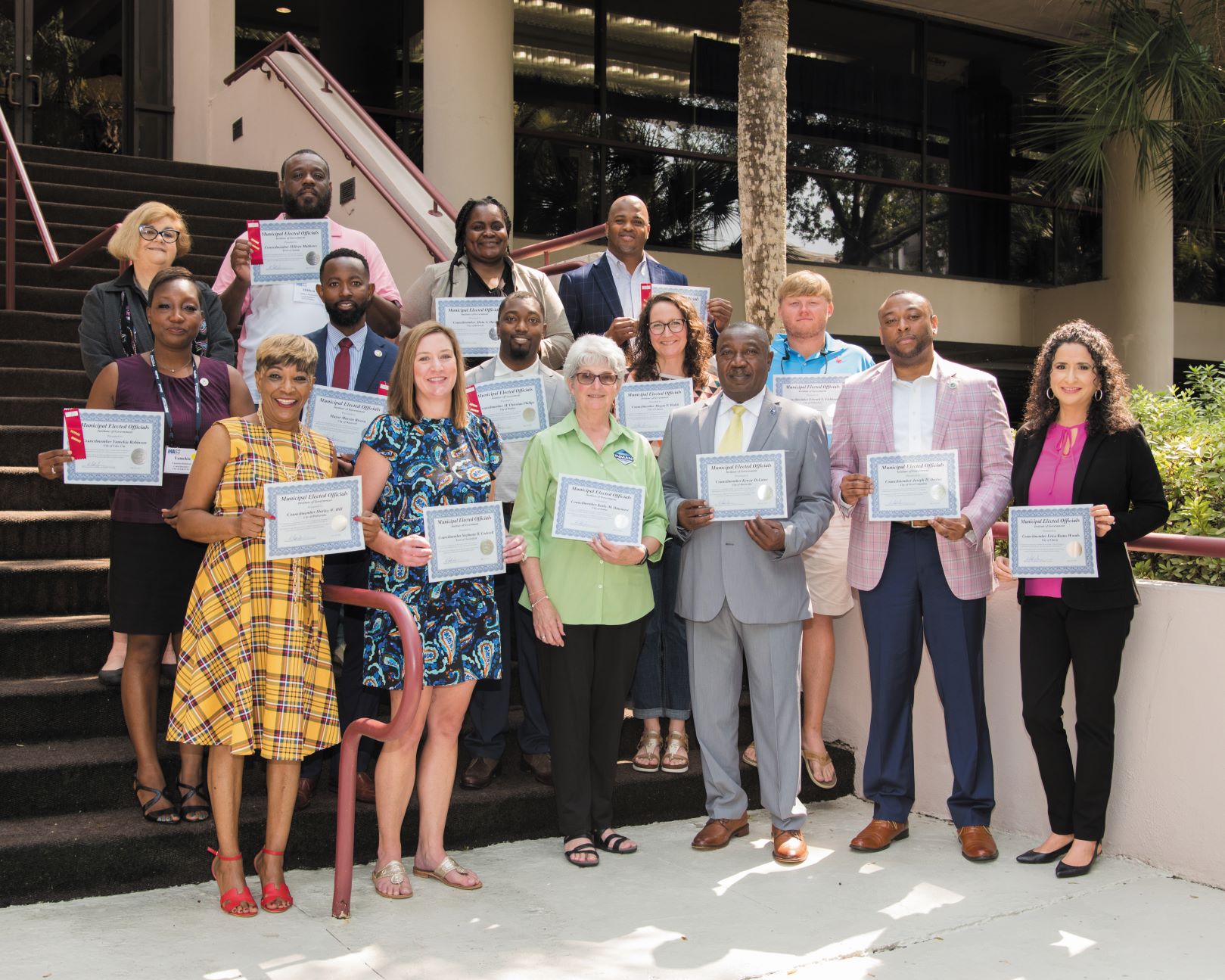 The summer 2021 graduates of the Municipal Elected Officials Institute of Government are: Councilmember Greg Addison of Union, Councilmember Mack Blackstone of Fountain Inn, Councilmember John Brooks of North Augusta, Councilmember Tammy Cain of Pamplico, Councilmember Andre Campbell of Mullins, Councilmember Stephanie Cockrell of Chesterfield, Councilmember Alicia Davis of Barnwell, Councilmember Kenzie DeLaine of Hartsville, Councilmember Joseph Dickey of West Columbia, Councilmember Kathy Dittemore of Inman, Councilmember Michael Drake of Surfside Beach, Councilmember Edward Fishburne of Walterboro, Councilmember Shirley Hill of Bishopville, Councilmember Katherine Houghton of Folly Beach, Councilmember Teresa Kuzniar of Mauldin, Councilmember Katherine Landing of Mount Pleasant, Councilmember Derrick Lindsay of Rock Hill, Councilmember Miliken Matthews of Saluda, Councilmember Carroll Padgett of Loris, Councilmember Scott Parker of Kiawah Island, Councilmember Patricia Partlow of Greenwood, Councilmember Laura Pendley of Briarcliffe Acres, Councilmember Mayo Phillips of Mullins, Councilmember Marion Ramsey of York, Mayor Marcus Rivera of Barnwell, Councilmember Yamekia Robinson of Lake City, Councilmember Kevin Toole of North Augusta, Councilmember Megan Walsh of Clinton, Councilmember Catherine Watt of Clemson, Councilmember Erica Woods of Liberty, and Councilmember Jason Wright of Pacolet. (Not all graduates are pictured.)