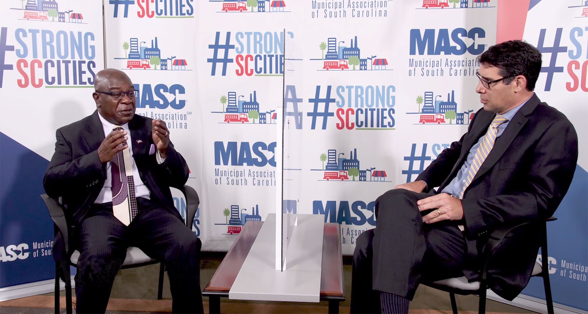 Lake City’s Mayor Lovith Anderson Jr., left, talks with Florence Mayor Stephen Wukela as part of the Municipal Association’s 2020 Virtual Annual Meeting.
