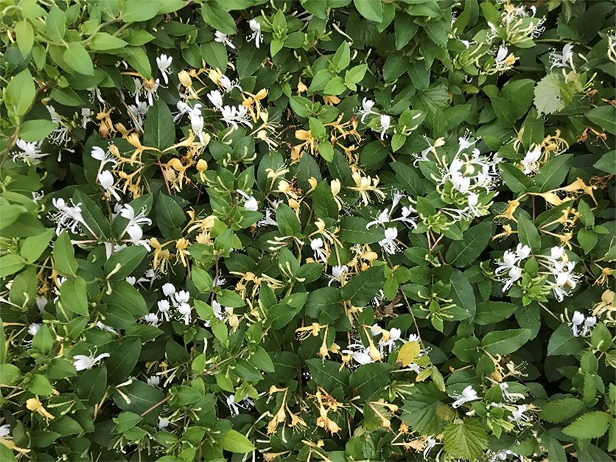 Japanese Honeysuckle grows rapidly, smothering plants and girdling trees.